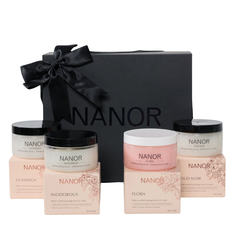 Our Ultimate Skin Care Essentials Set includes all of our 4 body scrubs in 4oz: NEW Flora, La Manga, Oud Noir, Inodorous. Perfect for anyone that loves skincare and is looking to get healthy glowing skin. Add our beautiful premium matte black box to make gifting simple yet chic. A gift that will impress. Perfect for any occasion.